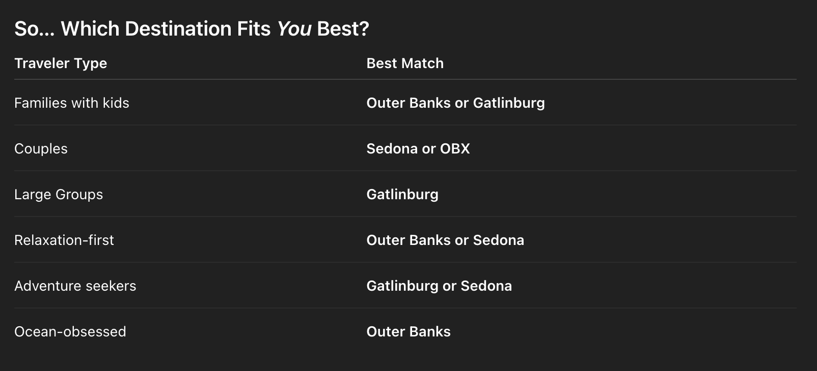 When it’s time to plan your next getaway, the hardest part is choosing where to go—especially when each destination offers something unforgettable. If you’re torn between the beaches of the Outer Banks, the mountains of Gatlinburg, or the red rock deserts of Sedona, this guide will help you choose the perfect escape for your travel style, mood, budget, and bucket-list dreams.