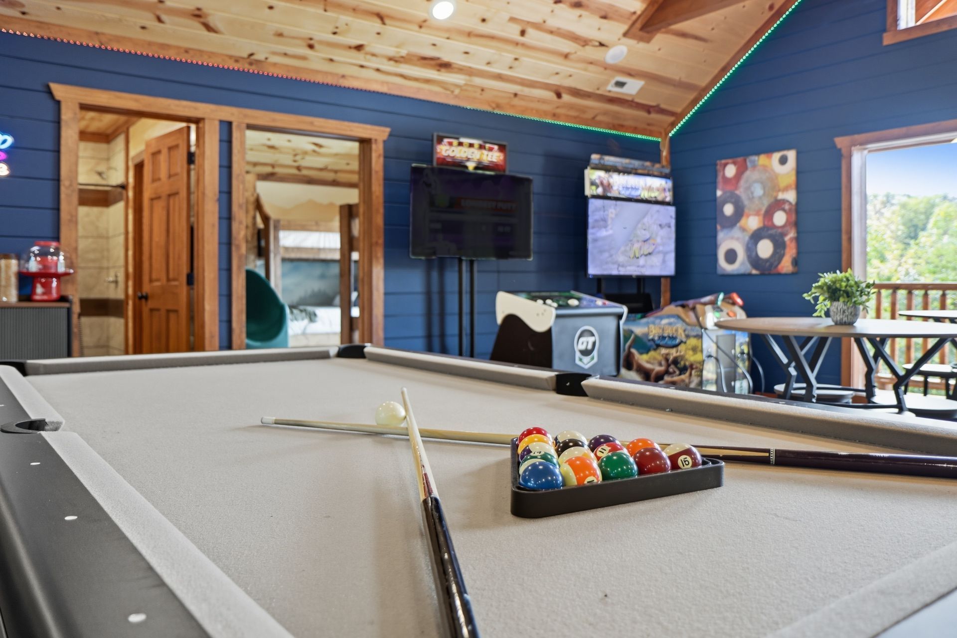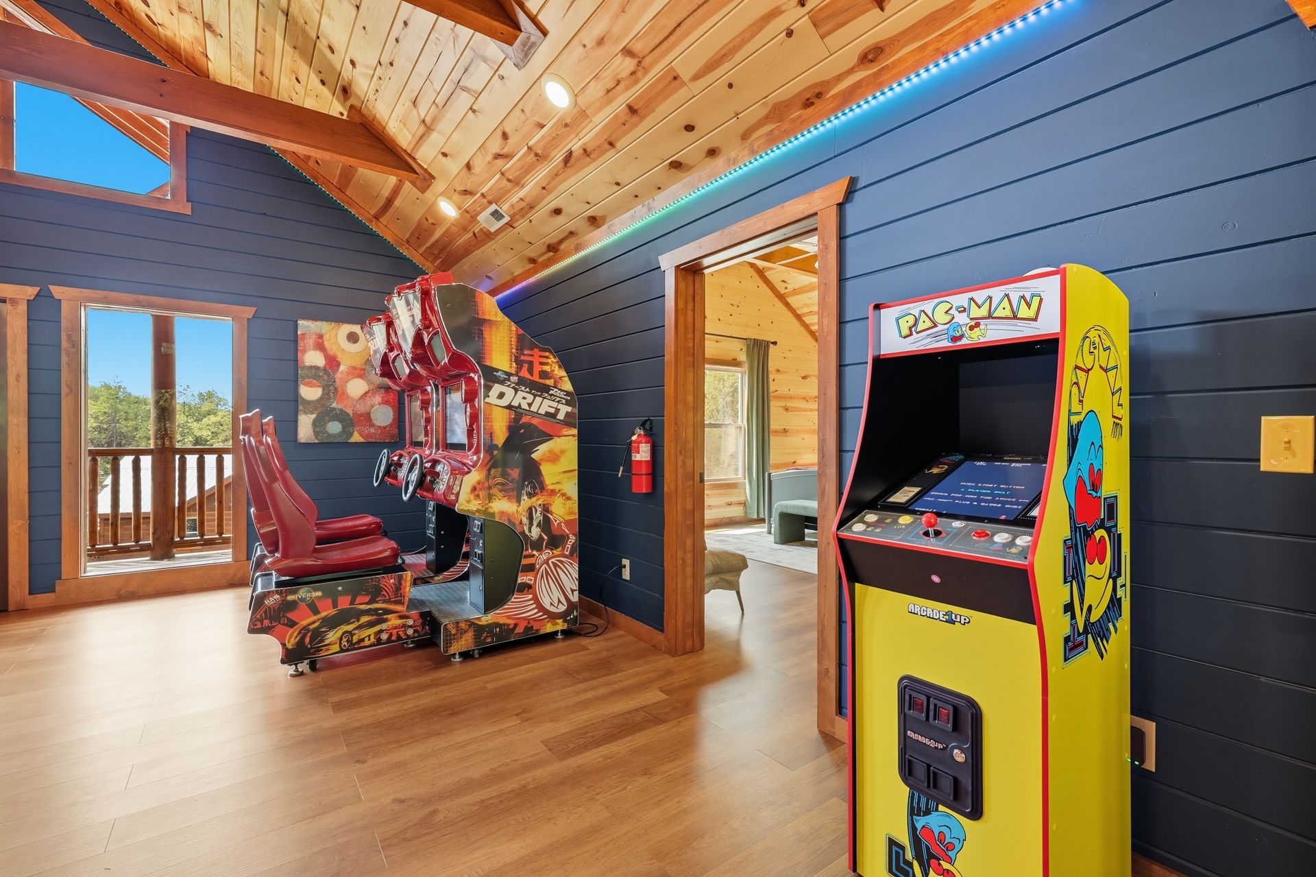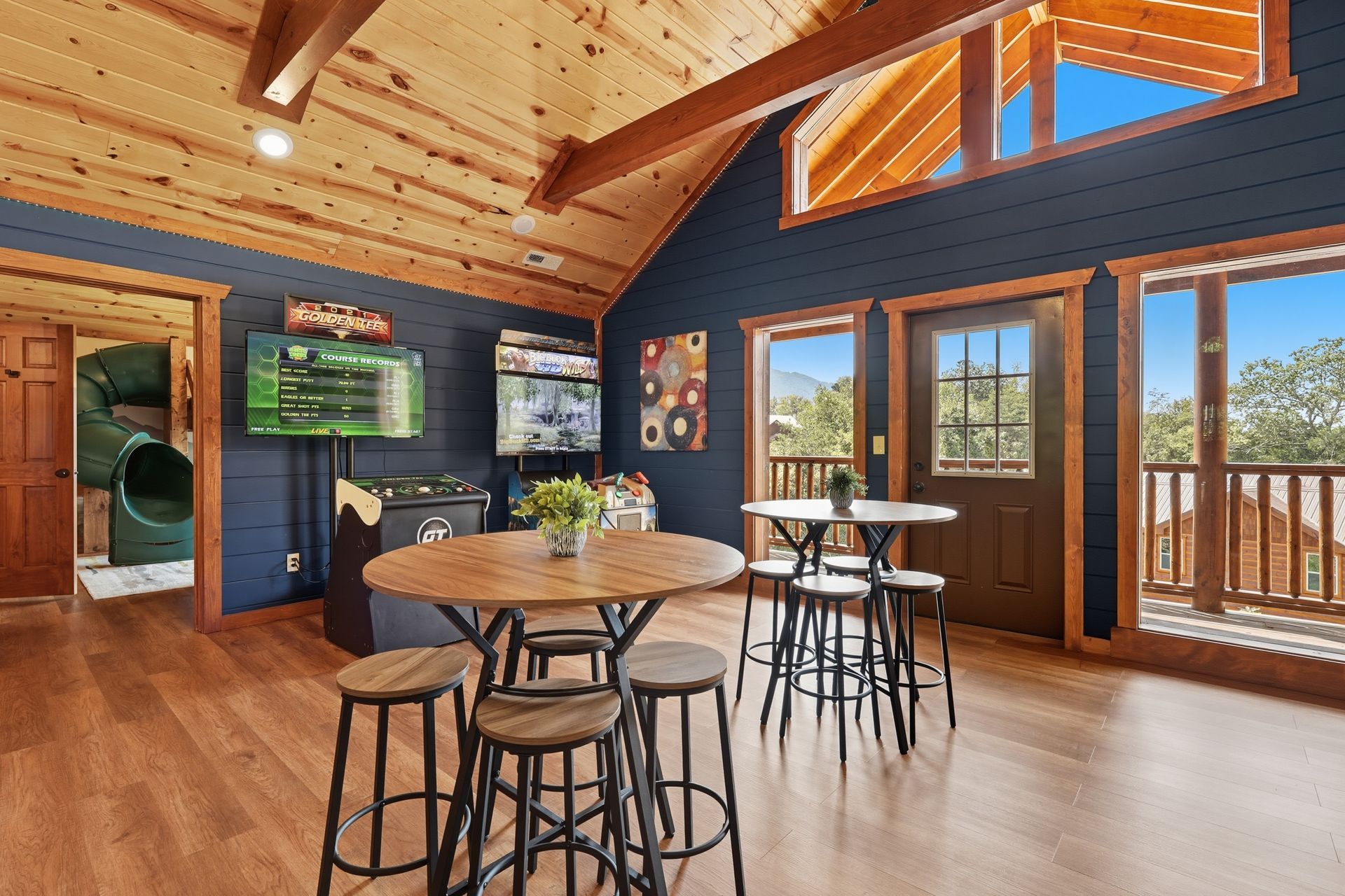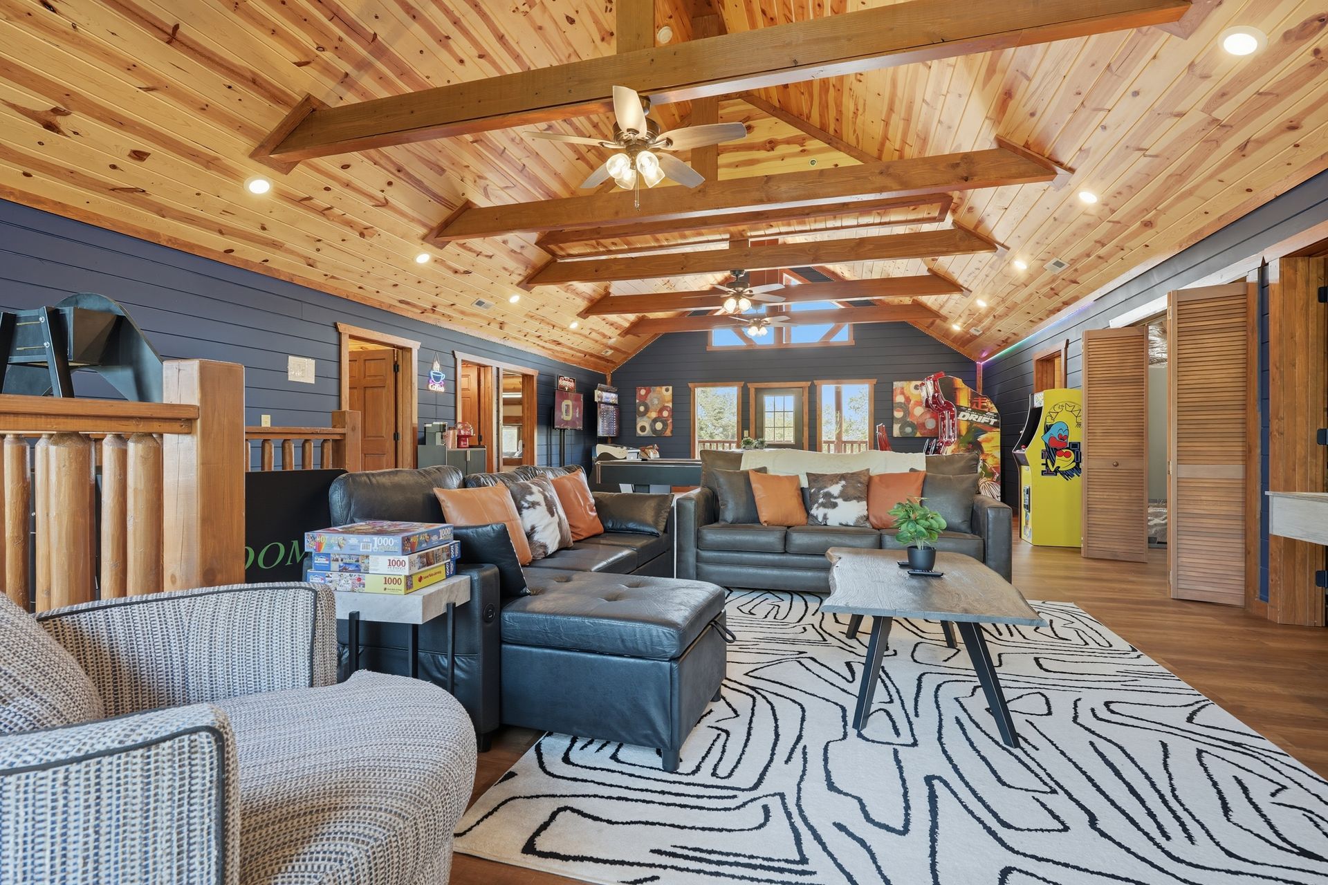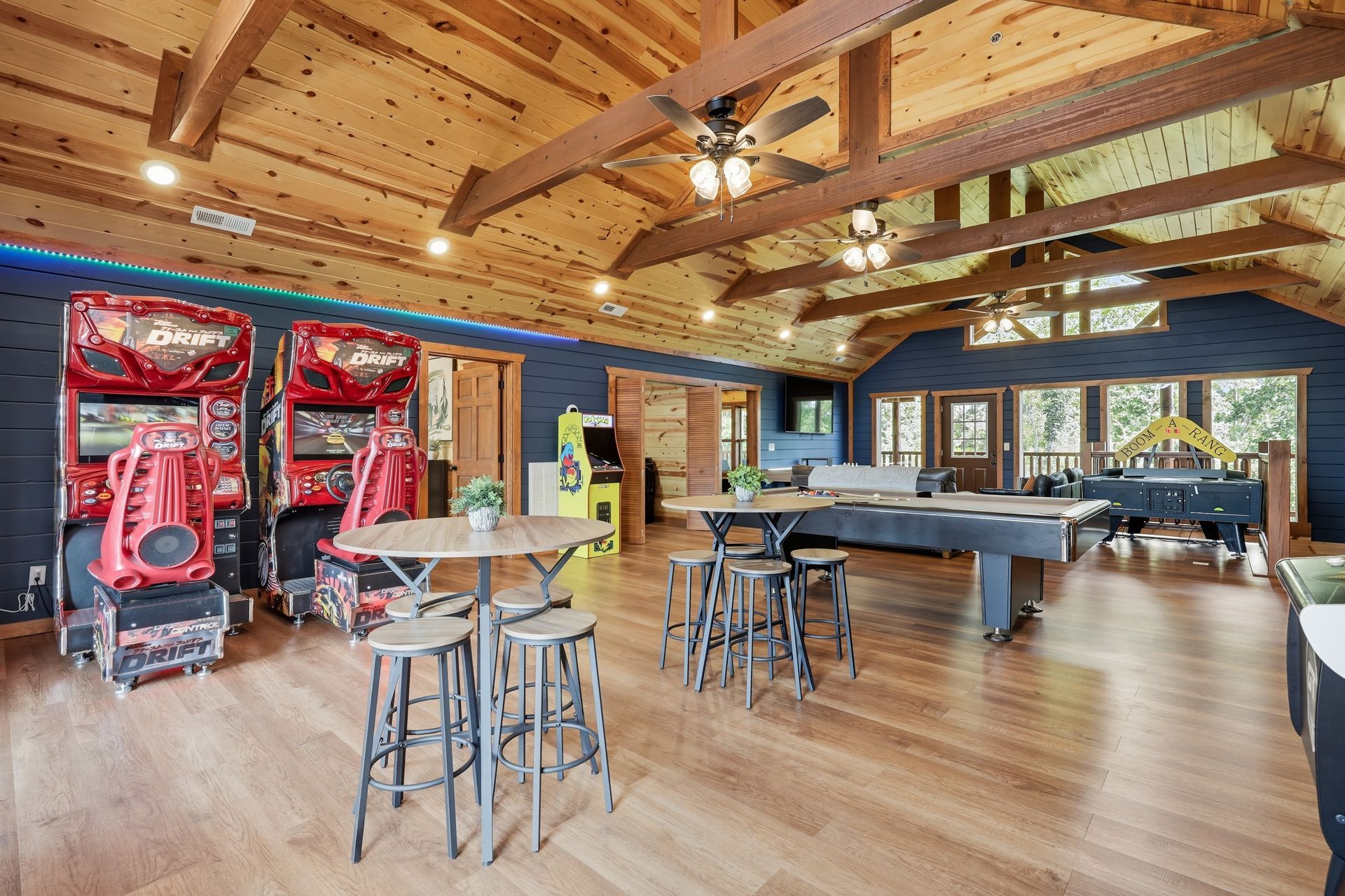Game Time Retreat is where play meets relaxation. Kids race down the bunk room slide, friends compete in the arcade-packed EPIC game room, and in the evenings gather around the fire pit as a waterfall cascades before you. Swim together beneath the stars in the galaxy-lit pool, watch movies on the rooftop theater, or unwind in the forest-view barrel sauna. With 8 en-suite bedrooms, 2 living areas, and dog-friendly comfort, this Smoky Mountain escape blends fun, relaxation, and lasting memories.