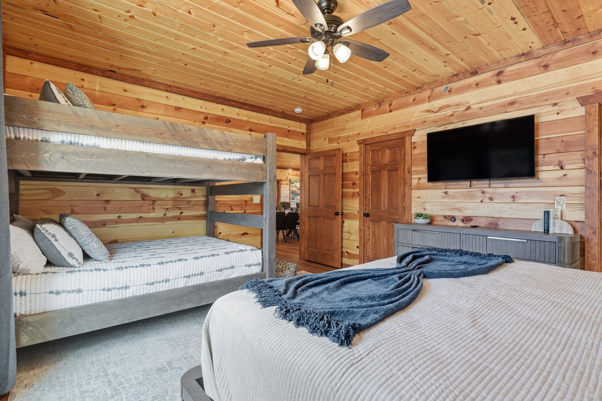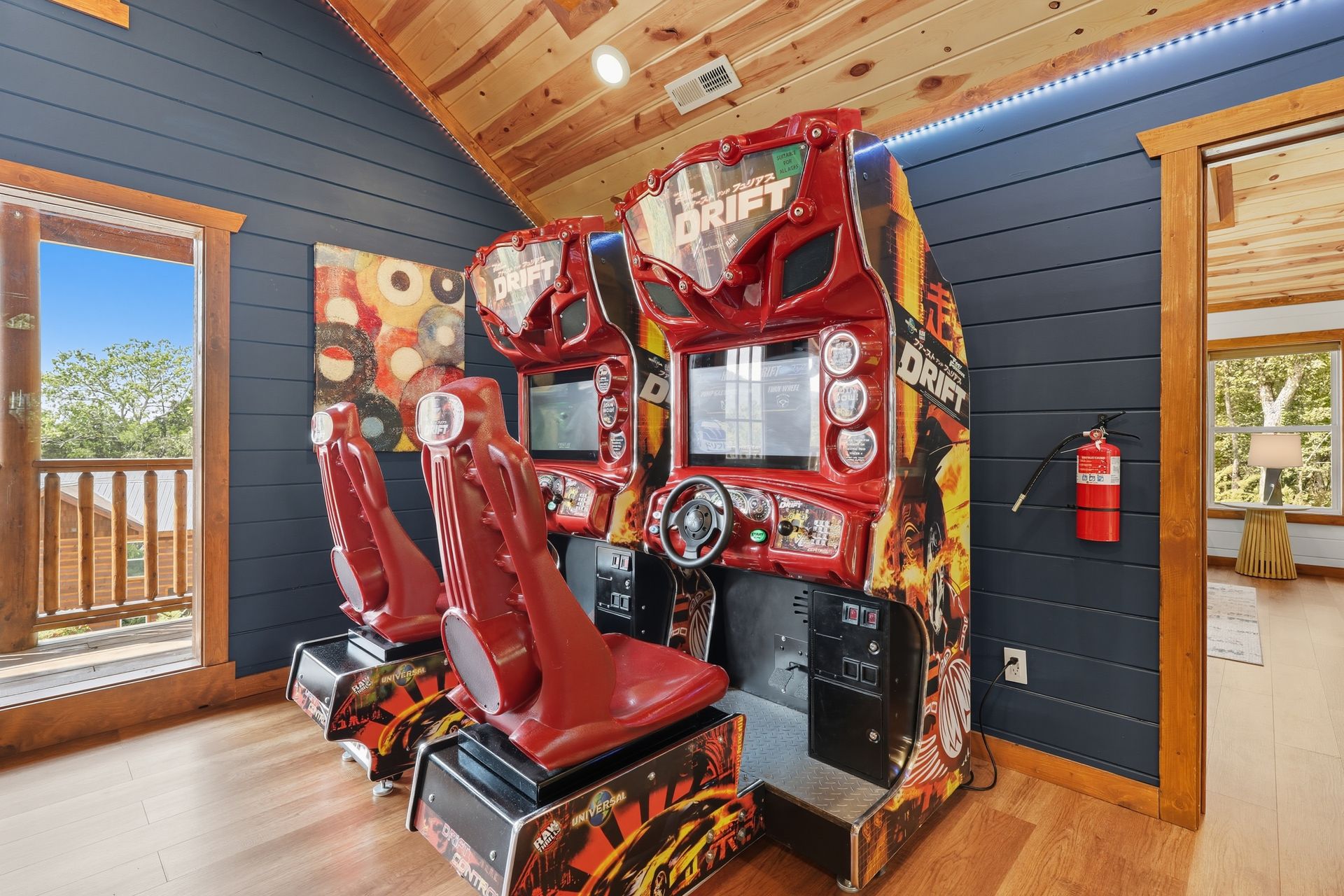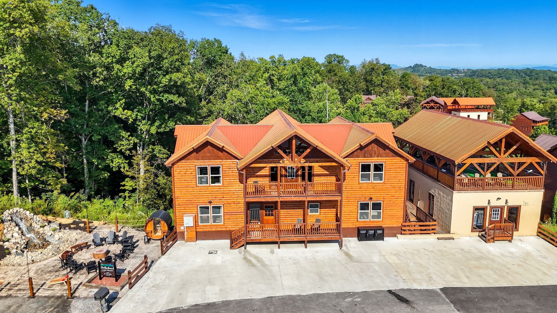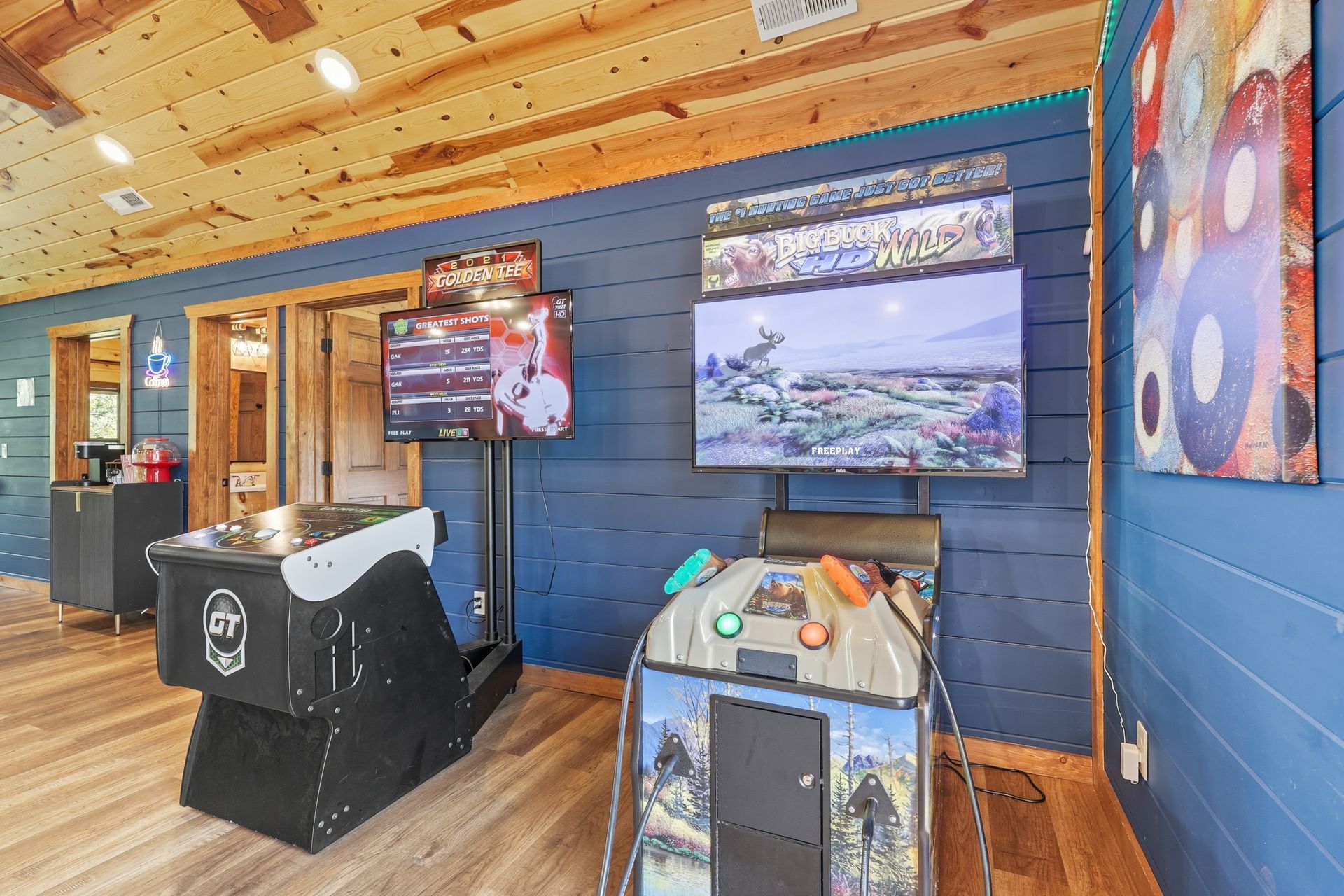 Game Time Retreat is where play meets relaxation. Kids race down the bunk room slide, friends compete in the arcade-packed EPIC game room, and in the evenings gather around the fire pit as a waterfall cascades before you. Swim together beneath the stars in the galaxy-lit pool, watch movies on the rooftop theater, or unwind in the forest-view barrel sauna. With 8 en-suite bedrooms, 2 living areas, and dog-friendly comfort, this Smoky Mountain escape blends fun, relaxation, and lasting memories.