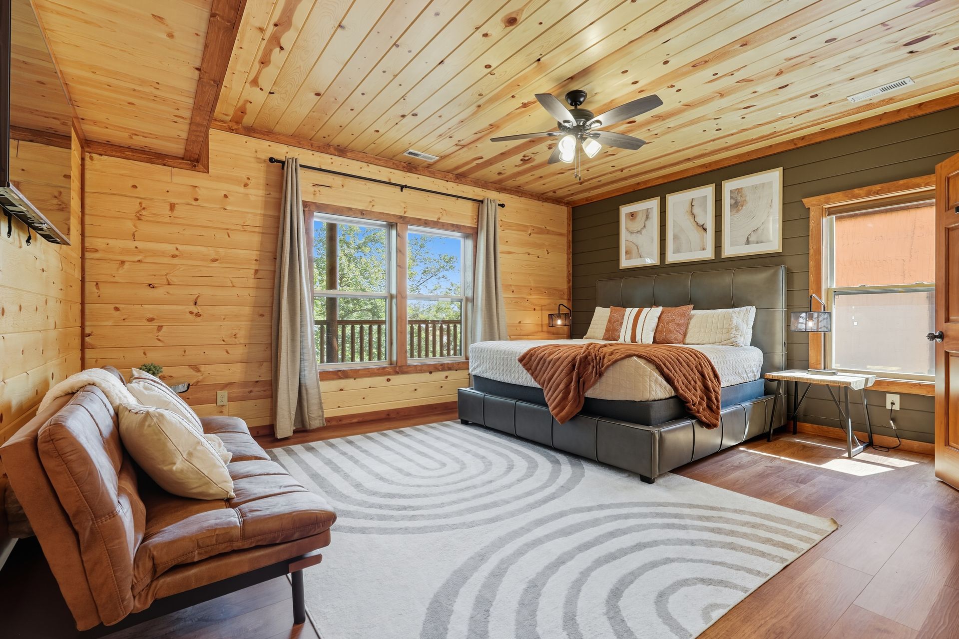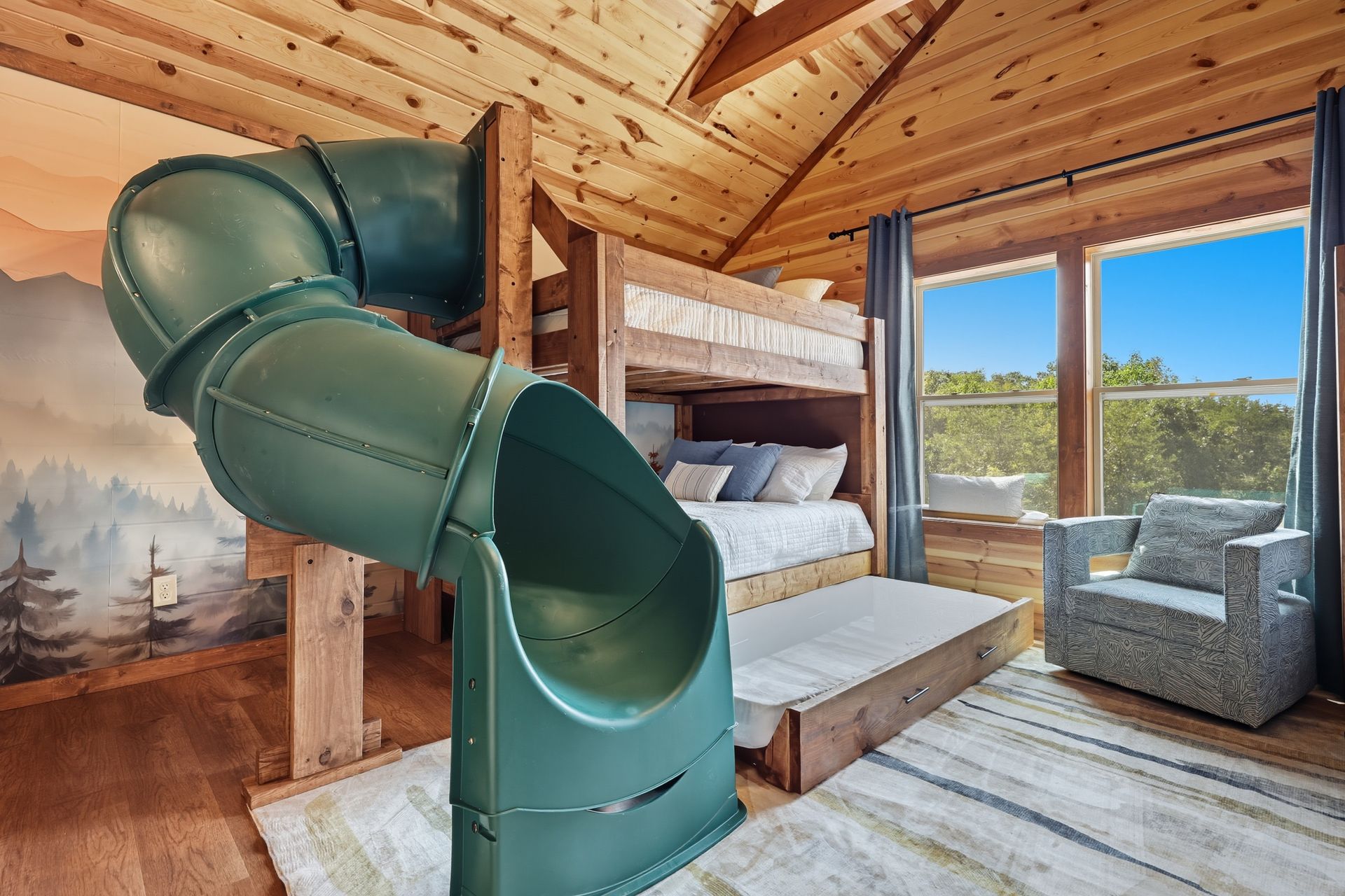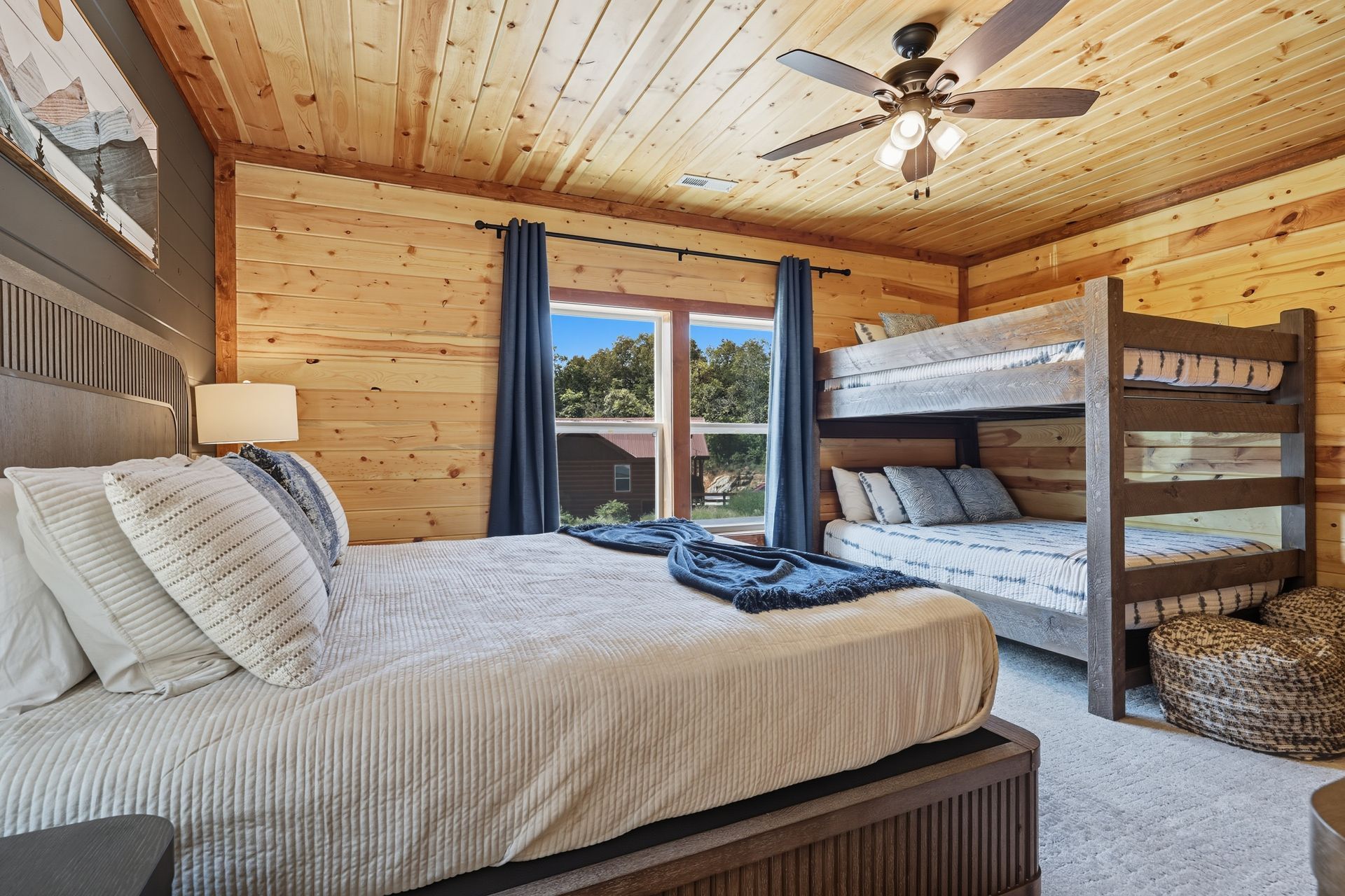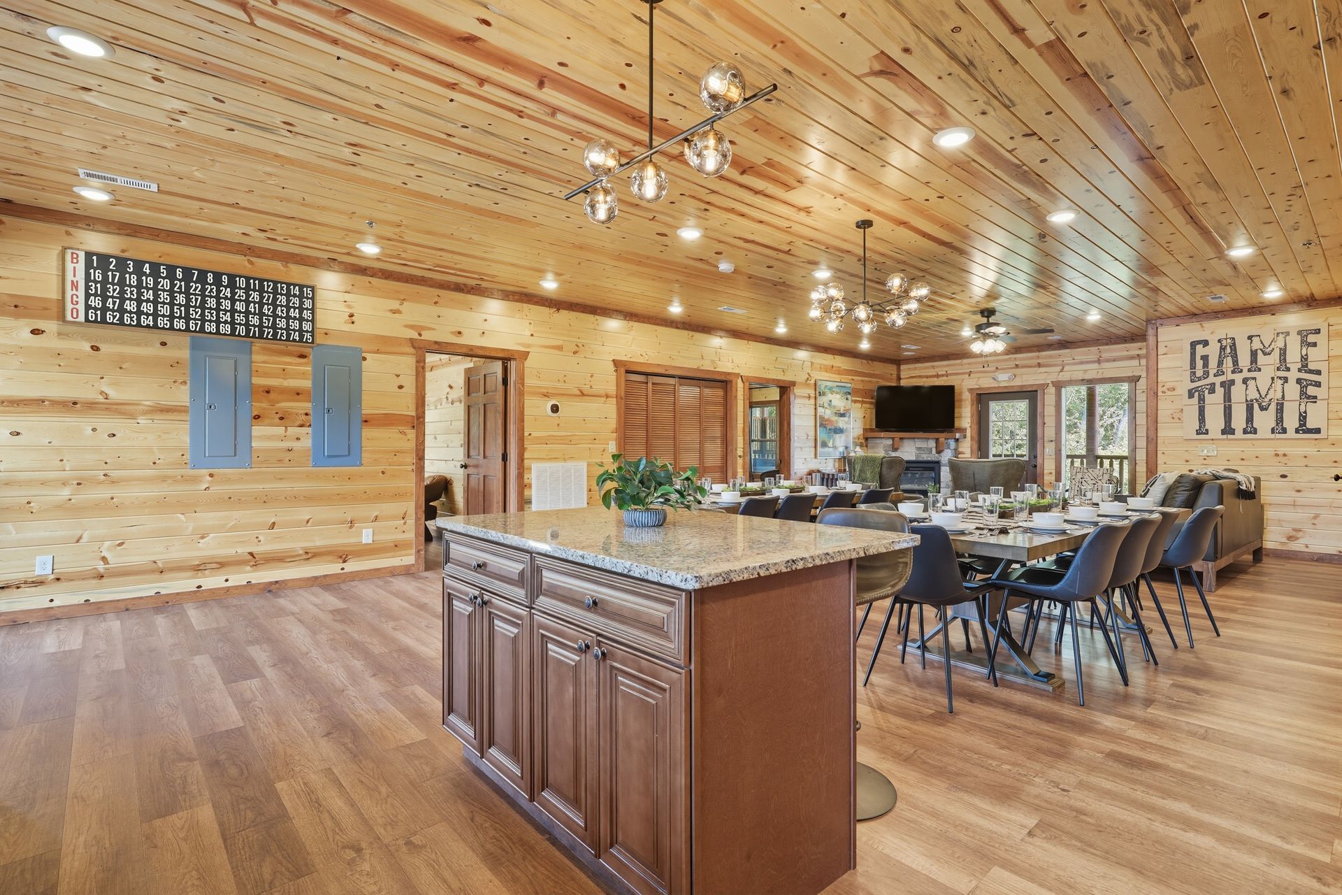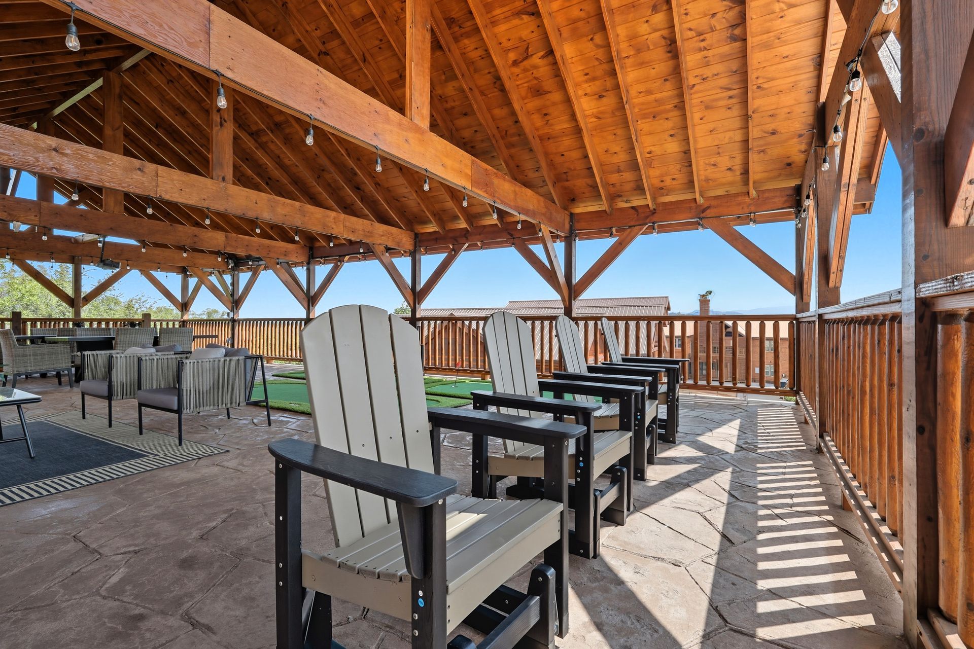 Game Time Retreat is where play meets relaxation. Kids race down the bunk room slide, friends compete in the arcade-packed EPIC game room, and in the evenings gather around the fire pit as a waterfall cascades before you. Swim together beneath the stars in the galaxy-lit pool, watch movies on the rooftop theater, or unwind in the forest-view barrel sauna. With 8 en-suite bedrooms, 2 living areas, and dog-friendly comfort, this Smoky Mountain escape blends fun, relaxation, and lasting memories.
