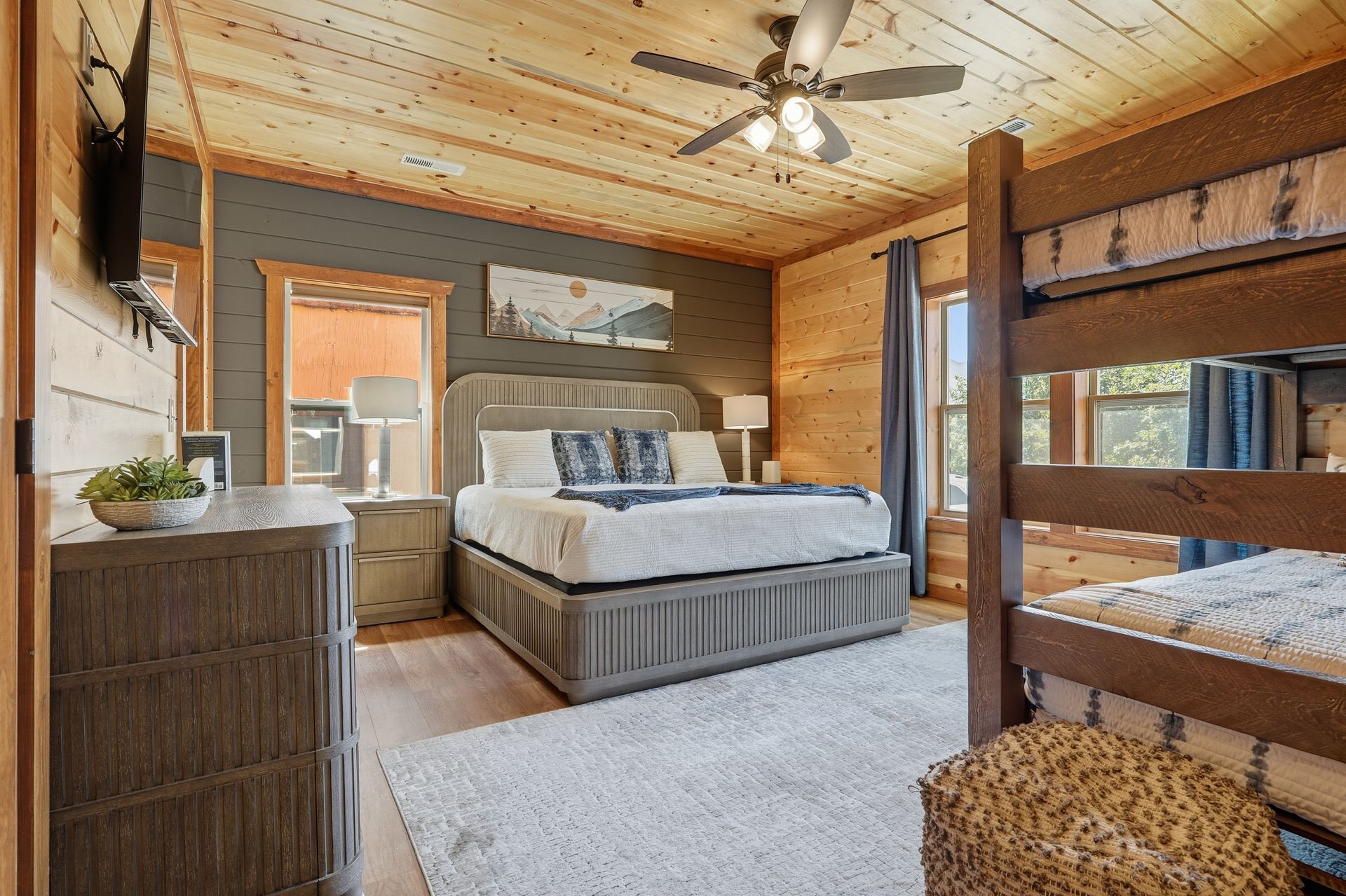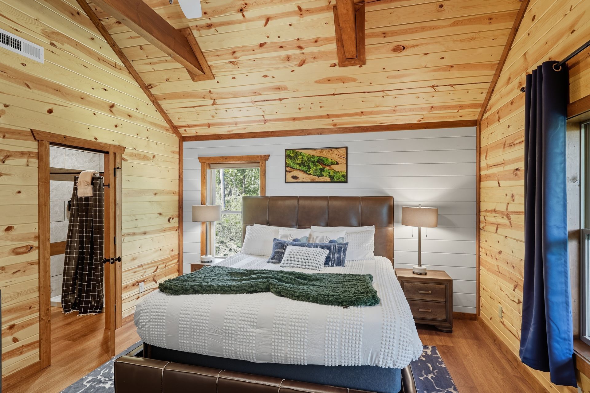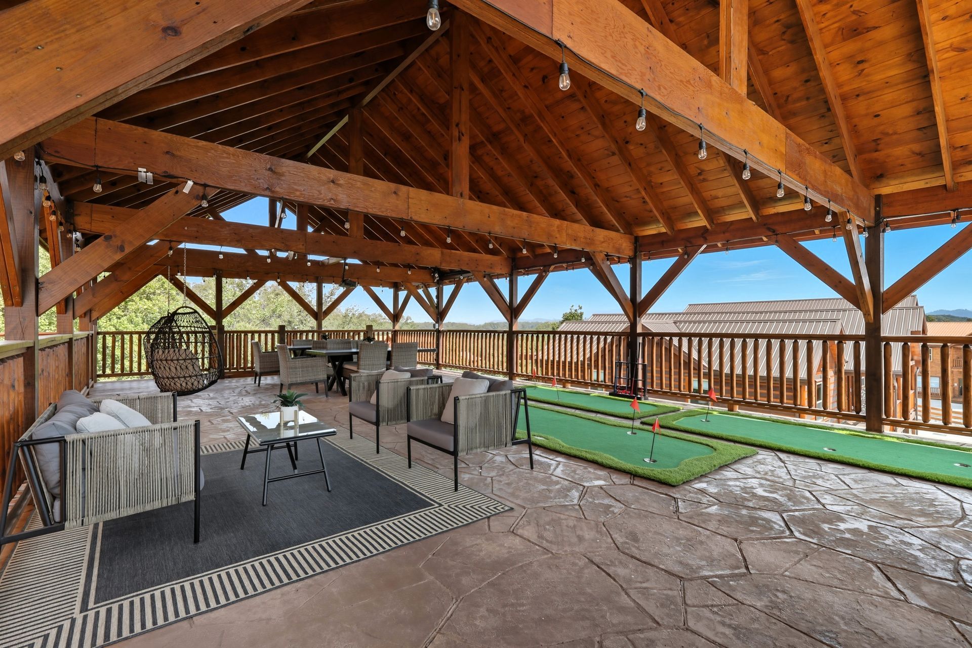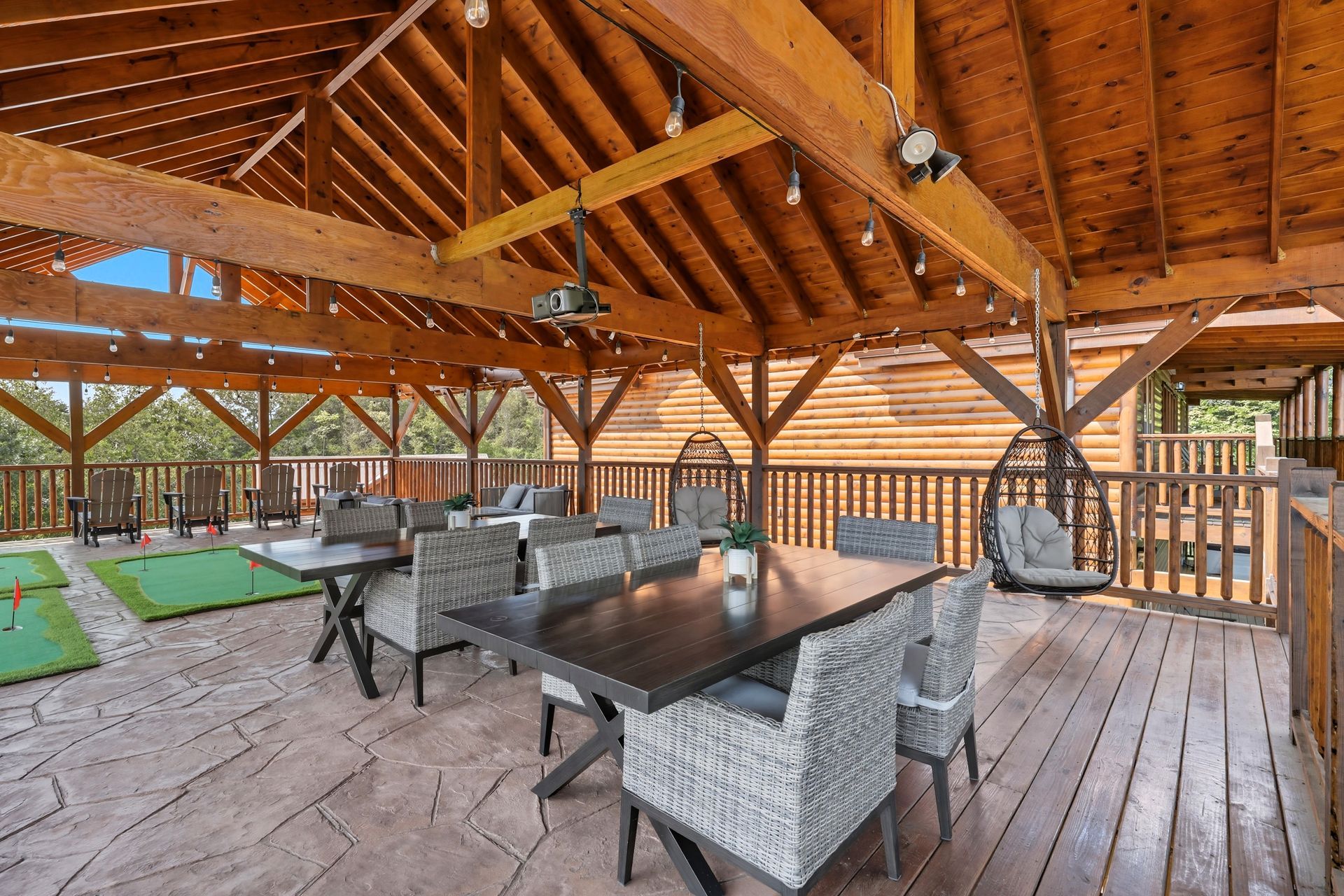 Game Time Retreat is where play meets relaxation. Kids race down the bunk room slide, friends compete in the arcade-packed EPIC game room, and in the evenings gather around the fire pit as a waterfall cascades before you. Swim together beneath the stars in the galaxy-lit pool, watch movies on the rooftop theater, or unwind in the forest-view barrel sauna. With 8 en-suite bedrooms, 2 living areas, and dog-friendly comfort, this Smoky Mountain escape blends fun, relaxation, and lasting memories.